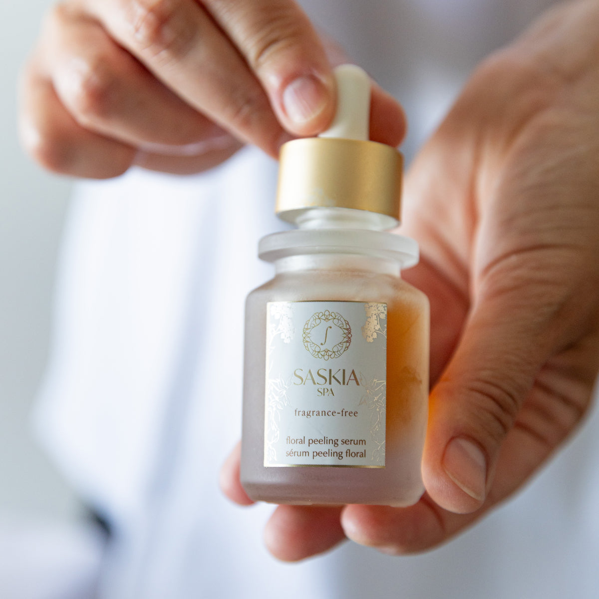 SASKIA Spa Floral Peeling Serum gently resurfaces the skin with hibiscus flower extract, rich in natural AHAs, to promote cell renewal and enhance radiance. It's hydrating complex attracts and retains moisture, smoothing texture and improving elasticity. The lightweight formula refines pores and evens tone, leaving skin soft, luminous, and revitalized.?˜