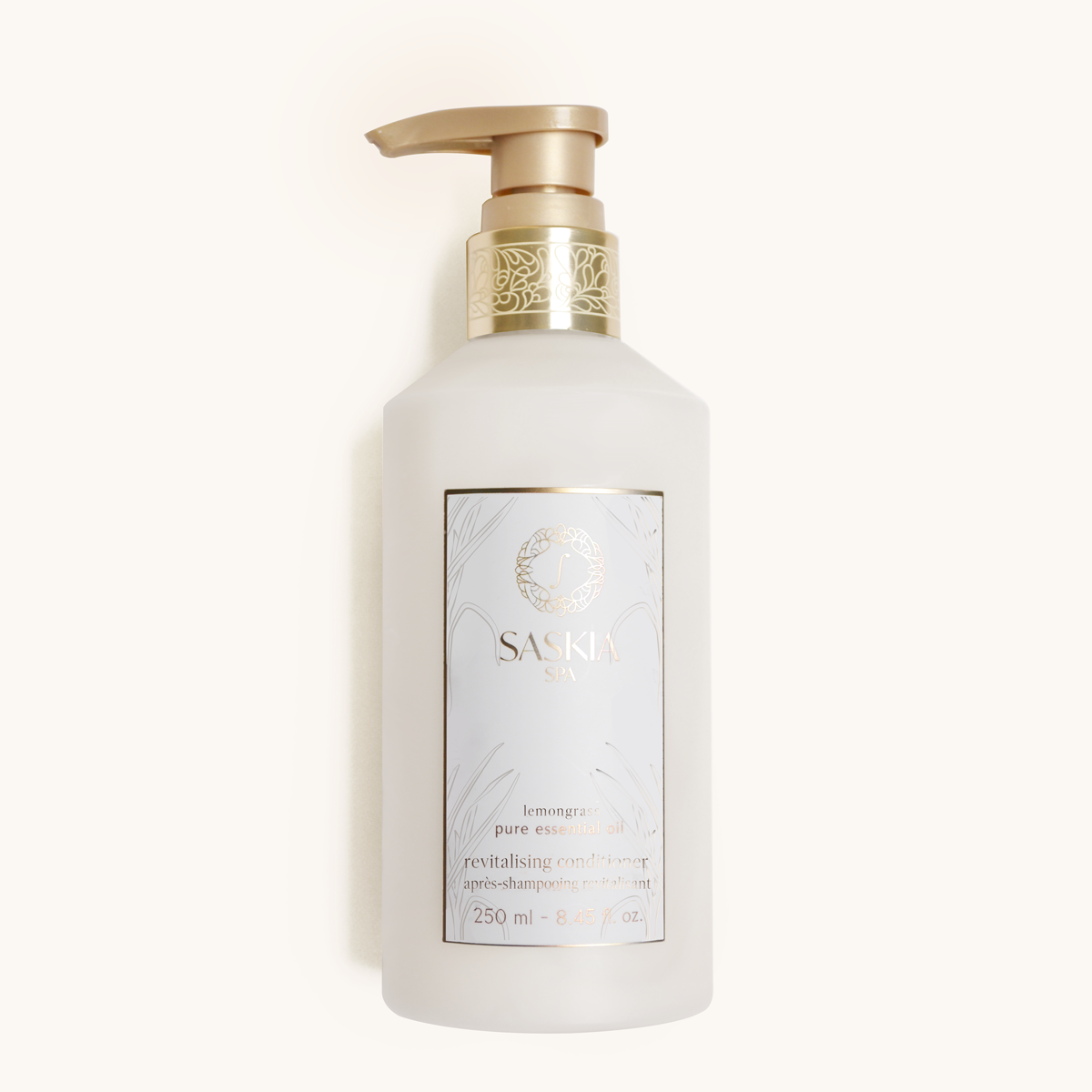 SASKIA Spa silicone-free detangling conditioner softens, smooths, and nourishes hair while easing knots for silky, manageable hair .Infused with refreshing lemongrass essential oil, it invigorates the scalp and leaves hair lightly scented with a crisp, citrusy aroma.